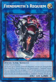 LIGHT Link 1 [<br>Fiend<br>/Link/Effect<br>] ATK 600 DEF – 1 LIGHT Fiend monster<br>You can only Special Summon "Fiendsmith's Requiem(s)" once per turn. During the Main Phase (Quick Effect): You can Tribute this card; Special Summon 1 "Fiendsmith" monster from your hand or Deck. You can target 1 LIGHT non-Link Fiend monster you control; equip this card from your field or GY to that monster you control as an Equip Spell that gives it 600 ATK. You can only use this effect of "Fiendsmith's Requiem" once per turn.