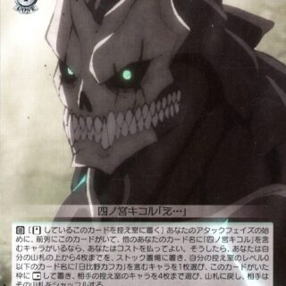 誇りある矜持 四ノ宮キコル<br>(<br>KJ8/S123-010S<br>)<br>-怪獣8号<br>サイド:<br>種類:キャラ<br>レベル:3<br>色:<br>パワー:9500<br>ソウル:<br>コスト:2<br>レアリティ:SR<br>トリガー:<br>特徴:<br>防衛隊・エリート<br>フレーバー:-<br>【永】 前列にこのカードがいるなら、あなたの、《防衛隊》か《怪獣》のキャラすべてに、パワーを+1000し、『【自】 アンコール [手札の、《防衛隊》か《怪獣》のキャラを1枚控え室に置く]』を与える。<br>【自】[手札の、《防衛隊》か《怪獣》のキャラを1枚控え室に置く] このカードが手札から舞台に置かれた時、他のあなたの、《防衛隊》か《怪獣》のキャラがいるなら、あなたはコストを払ってよい。そうしたら、相手は自分のストックすべてを、山札に戻し、その山札をシャッフルし、自分の山札の上から同じ枚数をストック置場に置く。