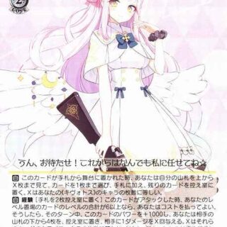 水羽ミモリ(水着)<br>(<br>BAV/W112-039SP<br>)<br>-ブルーアーカイブ<br>サイド:<br>種類:キャラ<br>レベル:0<br>色:<br>パワー:1000<br>ソウル:<br>コスト:0<br>レアリティ:SP<br>トリガー:-<br>特徴:<br>キヴォトス・修行部<br>フレーバー:-<br>【自】[(1)] このカードが手札から舞台に置かれた時、あなたはコストを払ってよい。そうしたら、あなたは自分の山札を上から3枚まで見て、カードを1枚選び、クロック置場に置き、残りのカードを控え室に置く。1枚クロック置場に置いたなら、あなたは自分の控え室の《キヴォトス》のキャラを1枚選び、手札に戻す。<br>【自】 このカードのバトル中、あなたの受けたダメージがキャンセルされた時、あなたはこのカードをストック置場に置いてよい。