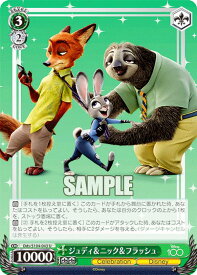 ジュディ&ニック&フラッシュ<br>(<br>Dds/S104-043S<br>)<br>-Disney100<br>サイド:<br>種類:キャラ<br>レベル:3<br>色:<br>パワー:10000<br>ソウル:<br>コスト:2<br>レアリティ:SR<br>トリガー:<br>特徴:<br>Celebration・Disney<br>フレーバー:-<br>【自】[手札を1枚控え室に置く] このカードが手札から舞台に置かれた時、あなたはコストを払ってよい。そうしたら、あなたは自分のクロックの上から1枚を、ストック置場に置く。<br>【自】[(2) 手札を2枚控え室に置く] このカードがアタックした時、あなたはコストを払ってよい。そうしたら、相手に2ダメージを与える。(ダメージキャンセルは発生する)