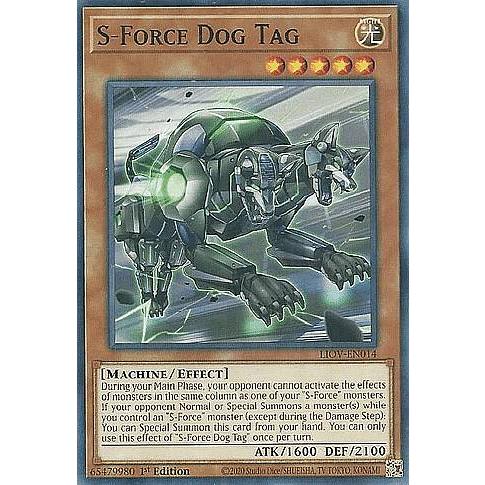 LIGHT Level 5 [<br>Machine<br>/Effect<br>] ATK 1600 DEF 2100 During your Main Phase, your opponent cannot activate the effects of monsters in the same column as one of your "S-Force" monsters. If your opponent Normal or Special Summons a monster(s) while you control an "S-Force" monster (except during the Damage Step): You can Special Summon this card from your hand. You can only use this effect of "S-Force Dog Tag" once per turn.