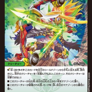 NEO進化:光、水、または闇のクリーチャー1体の上に置いてもよい。プレイヤーが手札を1枚捨てた時、または自分のターンのはじめに、自分の山札の上から1枚を表向きにし、このクリーチャーの下に置いてもよい。このクリーチャーの下のカードが6枚以下なら、このクリーチャーはバトルを行えず、離れない。このクリーチャーが攻撃する時、カードが7枚以上これの下にあれば、下にあるカードをすべて手札に戻してもよい。そうしたら、このターン、このクリーチャーに「ワールド・ブレイカー」を与える。その後、コスト9以下のカードを1枚、自分の手札からコストを支払わずに実行してもよい。