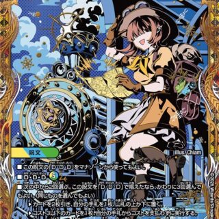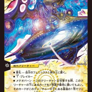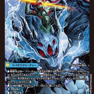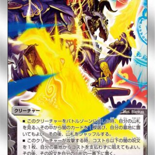 D・D・D [ff05]G-NEO進化:闇、火、または自然のクリーチャー1体の上に置いてもよい。W・ブレイカーこのクリーチャーが出た時、相手の「ブロッカー」を持つクリーチャーを1体選び、破壊する。このクリーチャーがシールドをブレイクした時、自分の山札の上から1枚を表向きにする。それがコスト6以下のクリーチャーなら出す。それ以外なら手札に加える。