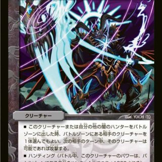 D・D・D [dfn04]G-NEO進化:闇、火、または自然のクリーチャー1体の上に置いてもよい。マッハファイターW・ブレイカーこのクリーチャーの攻撃の終わりに、コスト5以下のクリーチャーを1体、自分の墓地またはマナゾーンから出す。このターン、そのクリーチャーに「スピードアタッカー」を与える。