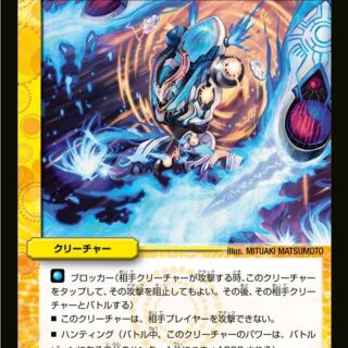 G-NEO進化:水、闇、または火のクリーチャー1体の上に置いてもよい。(カードが下にあれば、NEO進化クリーチャーとして扱い、離れる時、かわりに下のカードすべてが離れる)スピードアタッカーW・ブレイカーこのクリーチャーが出た時、自分の山札の上から3枚を墓地に置く。その後、カードを1枚、自分の墓地から手札に戻す。各ターン、はじめてカードが自分の墓地から離れた時、相手は自身のエレメントを1つ選び、破壊する。そうしなければ、このクリーチャーは相手のシールドを1つブレイクする。
