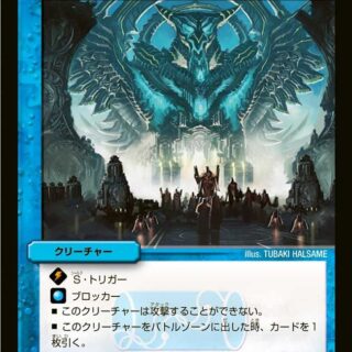 D・D・D [nn03](自分のクリーチャーが攻撃する時、このカードを [nn03]支払って自分の手札から実行してもよい)NEO進化:光、火、または自然のクリーチャー1体の上に置いてもよい。(カードが下にあれば、これをNEO進化クリーチャーとして扱う)T・ブレイカー(このクリーチャーはシールドを3つブレイクする)このクリーチャーは攻撃できない。