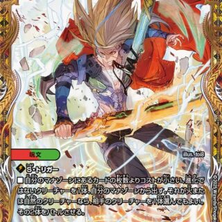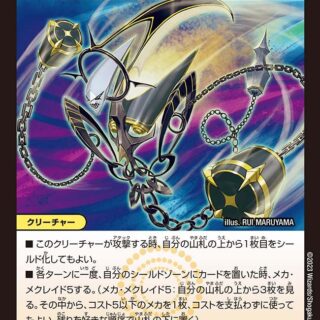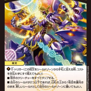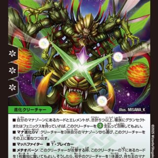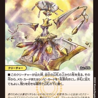 ブロッカー(このクリーチャーをタップして、相手クリーチャーの攻撃先をこのクリーチャーに変更してもよい)このクリーチャーが出た時、自分の山札の上から4枚をタップしてマナゾーンに置いてもよい。そうしたら、カードを2枚、自分のマナゾーンから好きな順序で山札の上に置く。
