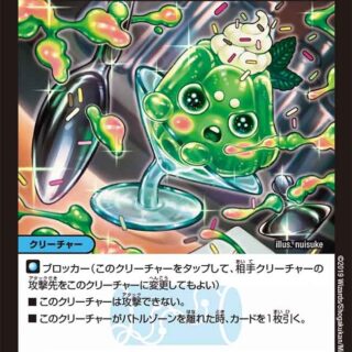 スピードアタッカーパワーアタッカー+5000T・ブレイカーこのクリーチャーが攻撃する時、相手とガチンコ・ジャッジする。自分が勝ったら、このターンの後に自分のターンを追加する。(ガチンコ・ジャッジ:自分と相手は自身の山札の上から1枚を表向きにし、それを下に置く。そのカードのコストが相手以上なら、自分の勝ちとする)