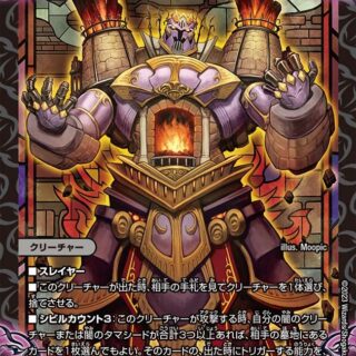 革命チェンジ:コスト7以上の名前に《ボルシャック》とある多色クリーチャーT・ブレイカーこのクリーチャーが出た時、自分の山札の上から4枚を見て、その中から《竜皇神 ボルシャック・バクテラス》ではないアーマードを好きな数出す。残りを好きな順序で山札の下に置く。自分の他のクリーチャーすべてに「ブロッカー」と「スピードアタッカー」を与える。各ターンの終わりに、自分の他のクリーチャーをすべてアンタップする。