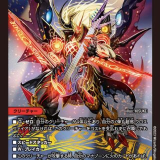進化:フェニックス・クリーチャー1体の上に置く。T・ブレイカーメテオバーン :このクリーチャーが攻撃する時、このクリーチャーの下にあるカードを1枚墓地に置いてもよい。それがこのクリーチャーの下にあった最後の1枚でフェニックス・カードなら、自分はゲームに勝つ。