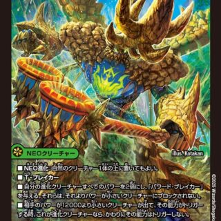 ブロッカーW・ブレイカーこのクリーチャーが出た時、次の中から2つ選ぶ。(同じものを2回選んでもよい。)▶相手のクリーチャーを1体選ぶ。このターン、そのクリーチャーのパワーを-4000する。▶自分の山札の上から4枚を墓地に置く。▶コスト4以下のクリーチャーを1体、自分の墓地から出す。このクリーチャーが離れる時、かわりに自分の他のクリーチャーを1体破壊してもよい。