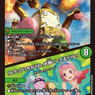 S・バック:サイバー(サイバー・カードを自分のシールドゾーンから手札に加える時、そのカードを捨ててもよい。そうしたら、コストを支払わずにこのカードを実行する)相手のクリーチャーを1体選び、持ち主の手札に戻す。カードを2枚まで引く。