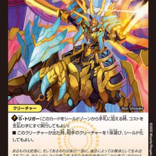 S・トリガー(このカードをシールドゾーンから手札に加える時、コストを支払わずにすぐ実行してもよい)自分の山札の上から4枚を表向きにする。その中からパワー12000以上のクリーチャーをすべて、手札に加える。残りを好きな順序で山札の下に置く。