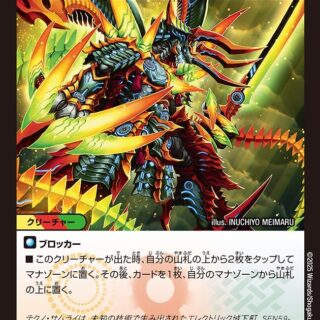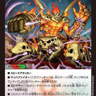 S・トリガーNEO進化:闇、火、または自然のクリーチャー1体の上に置いてもよい。(カードが下にあれば、これをNEO進化クリーチャーとして扱う)W・ブレイカーこのクリーチャーが出た時、相手のクリーチャーを1体選んでもよい。その選んだクリーチャーとこのクリーチャーをバトルさせる。相手のターン中に、このクリーチャーが出た時、これが進化クリーチャーでなければ、このクリーチャーを破壊する。