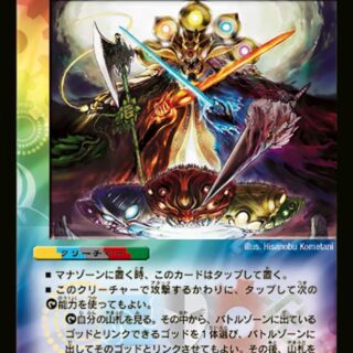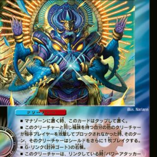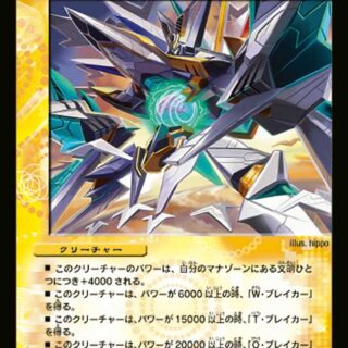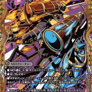 NEO進化:闇、火、または自然のクリーチャー1体の上に置いてもよい。(カードが下にあれば、これをNEO進化クリーチャーとして扱う)W・ブレイカー自分の他のクリーチャーが破壊された時、そのクリーチャーを自分の墓地からこのクリーチャーの下に置いてもよい。メテオバーン:このクリーチャーが攻撃する時、このクリーチャーの下にあるカードを1枚墓地に置いてもよい。そうしたら、相手のクリーチャーを1体選ぶ。その選んだクリーチャーとこのクリーチャーをバトルさせる。