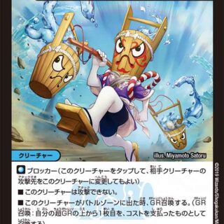 ブロッカー(このクリーチャーをタップして、相手クリーチャーの攻撃先をこのクリーチャーに変更してもよい)このカードが墓地に置かれた時、その直前にバトルゾーンにあれば、自分の山札の上から1枚をシールド化してもよい。
