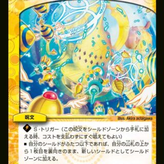 S・トリガー(このカードをシールドゾーンから手札に加える時、コストを支払わずにすぐ実行してもよい)自分のクリーチャー1体につき、相手のクリーチャーを1体選び、タップする。