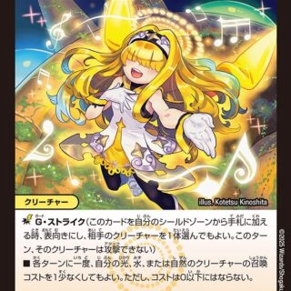 {GS} G・ストライク(このカードを自分のシールドゾーンから手札に加える時、表向きにし、相手のクリーチャーを1体選んでもよい。このターン、そのクリーチャーは攻撃できない)このカードが墓地に置かれた時、その直前にバトルゾーンにあれば、相手のパワー4000以下のクリーチャーを1体選び、破壊する。