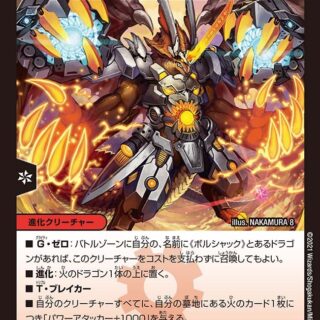 G-NEO進化:水、闇、または火のクリーチャー1体の上に置いてもよい。(カードが下にあれば、NEO進化クリーチャーとして扱い、離れる時、かわりに下のカードすべてが離れる)ブロッカーW・ブレイカーこのクリーチャーが出た時、カードを2枚引き、自分の手札を2枚捨てる。その後、コスト4以下のアビス・クリーチャーを1体、自分の墓地から出してもよい。各ターン、はじめて自分の、進化クリーチャーまたはアビス・クリーチャーをタップした時、それをアンタップする。