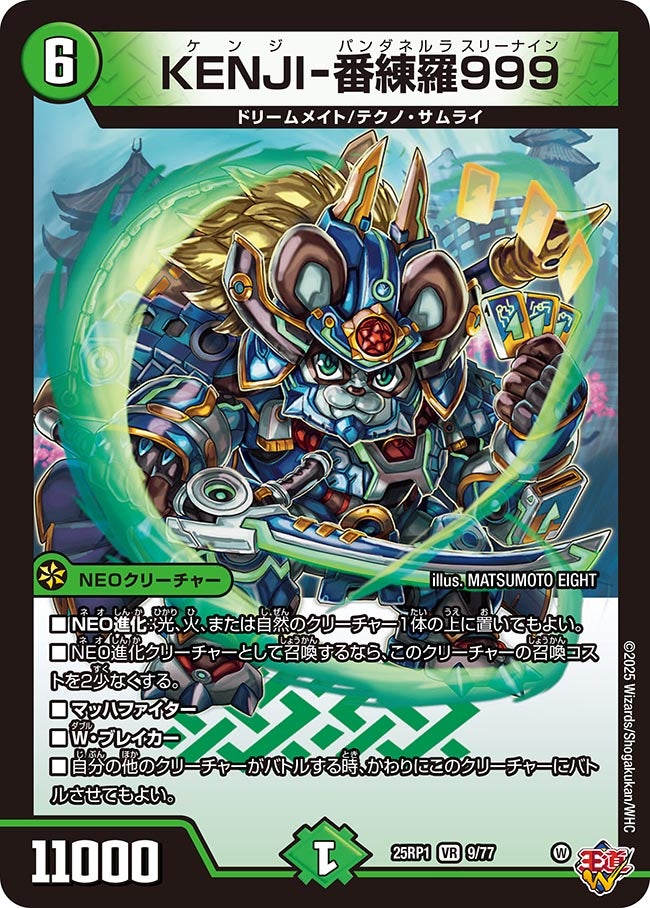 NEO進化:光、火、または自然のクリーチャー1体の上に置いてもよい。NEO進化クリーチャーとして召喚するなら、このクリーチャーの召喚コストを2少なくする。マッハファイターW・ブレイカー自分の他のクリーチャーがバトルする時、かわりにこのクリーチャーにバトルさせてもよい。