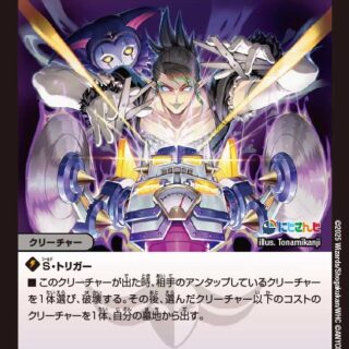 ブロッカー(このクリーチャーをタップして、相手クリーチャーの攻撃先をこのクリーチャーに変更してもよい)スピードアタッカーW・ブレイカーこのクリーチャーが出た時、カードを2枚引く。このクリーチャーが攻撃する時、コスト6以下の呪文を1枚、自分の手札または墓地からコストを支払わずに唱えてもよい。それを唱えた後、墓地のかわりに山札の下に置く。