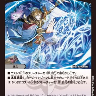 S・トリガー(このカードをシールドゾーンから手札に加える時、コストを支払わずにすぐ実行してもよい)自分の山札の上から6枚を見る。その中からクリーチャーを1体表向きにし、手札に加えてもよい。その後、残りを好きな順序で山札の下に置く。