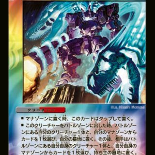 S・トリガーブロッカーこのクリーチャーが出た時、自分の山札の上から2枚を墓地に置く。その後、コスト5以下のクリーチャーを1体、自分の墓地から出す。相手のターン中に、このクリーチャーが出た時、このターンに2つ以上自分のシールドがブレイクされていなければ、このクリーチャーを破壊する。