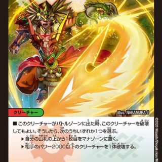 {GS} G・ストライク(このクリーチャーを自分のシールドゾーンから手札に加える時、相手に見せ、相手のクリーチャーを1体選んでもよい。このターン、そのクリーチャーは攻撃できない)スレイヤー(このクリーチャーがバトルする時、バトルの後、相手クリーチャーを破壊する)相手のターン中、相手が自身の手札以外から自身のマナゾーンにカードを置く時、かわりに墓地に置く。