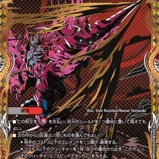水晶ソウル3T・ブレイカー自分のクリーチャーは、出たターンにプレイヤーを攻撃できる。各ターン、はじめて自分のクリーチャーが攻撃する時、そのクリーチャーを破壊してもよい。そうしたら、自分の山札の上から、アンノウン・クリーチャーまたはゼニス・クリーチャーが出るまで表向きにする。そのクリーチャーを出し、その後、山札をシャッフルする。エターナル・Κ(このクリーチャーが離れる時、かわりに自分のマナゾーンにある裏向きのカードを3枚、表向きにしてもよい)