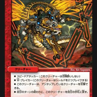 水晶ソウル3(このクリーチャーを召喚する時、自分のマナゾーンにある裏向きのカードのマナの数字は3になる)T・ブレイカー自分のクリーチャーが出た時、相手のクリーチャーを1体選んでもよい。その2体をバトルさせる。クリーチャーは、パワーではなくコストの大きさを比べてバトルする。エターナル・Κ(このクリーチャーが離れる時、かわりに自分のマナゾーンにある裏向きのカードを3枚、表向きにしてもよい)