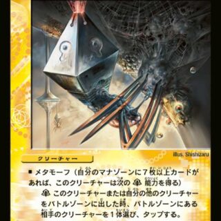 W・ブレイカーこのクリーチャーが出た時または攻撃する時、自分の山札の上から2枚を見る。そのうちの1枚をシールド化し、もう1枚を手札に加える。自分のシールドゾーンにあるスノーフェアリーすべてに「S・トリガー」を与える。真・エスケープ(このクリーチャーが離れる時、かわりに自分のシールドを2つ手札に加えてもよい。ただし、その「S・トリガー」は使えない)