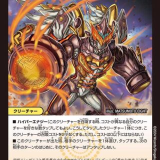 超無限進化:デーモン・コマンド・クリーチャー1体以上の上に置く。ワールド・ブレイカー(このクリーチャーは相手のシールドをすべてブレイクする)このクリーチャーが出た時、3枚以上のカードの上に進化していれば、相手は自身の手札をすべて捨てる。5枚以上のカードの上に進化していれば、次の自分のターンのはじめまで、相手のマナゾーンにあるすべてのカードのマナの数字を0にする。このクリーチャーが攻撃する時、文明を1つ選び、その文明を持つ相手のエレメントをすべて破壊する。