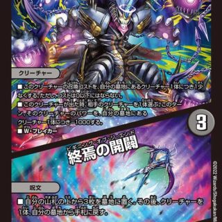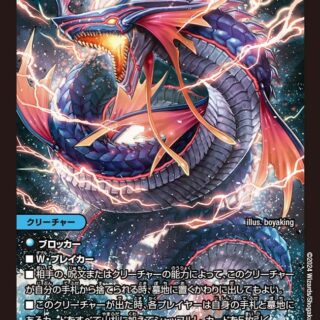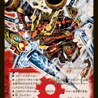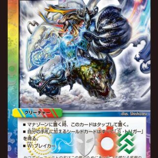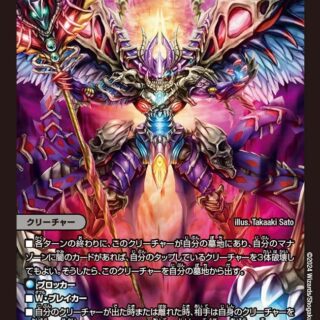 ハイパーエナジー(このクリーチャーを召喚する時、コストが異なる自分のクリーチャーを好きな数タップしてもよい。こうしてタップしたクリーチャー1体につき、このクリーチャーの召喚コストを2少なくする。ただし、コストは0以下にはならない)T・ブレイカーこのクリーチャーが召喚によって出た時、または相手プレイヤーを攻撃する時、自分の山札の上から5枚まで墓地に置く。その後、コスト5以下の、コストが異なるクリーチャーを好きな数、自分の墓地から出す。