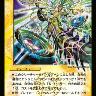 W・ブレイカーこのクリーチャーが出た時、自分のツインパクト・クリーチャーがあれば、山札の上から1枚目をマナゾーンに置く。自分のツインパクト・クリーチャーすべてに「スピードアタッカー」を与える。各ターンに一度、自分のツインパクト・クリーチャーが攻撃する時、そのクリーチャーの呪文側を、バトルゾーンに置いたままコストを支払わずに唱えてもよい。