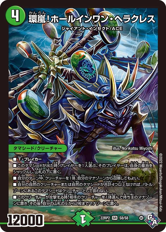 T・ブレイカーこのタマシードが出た時、プレイヤーを1人選ぶ。そのプレイヤーは、自身の墓地をシャッフルし、山札の下に置く。自分のターンに一度、クリーチャーを1体、自分のマナゾーンから召喚してもよい。自分の自然のクリーチャーまたは自然のタマシードが合計4つ以上なければ、バトルゾーンにあるこのタマシードはクリーチャーとして扱わない。このクリーチャーが攻撃する時、相手のクリーチャーを1体選んで持ち主のマナゾーンに置く。その後、自分の山札の上から2枚までマナゾーンに置く。