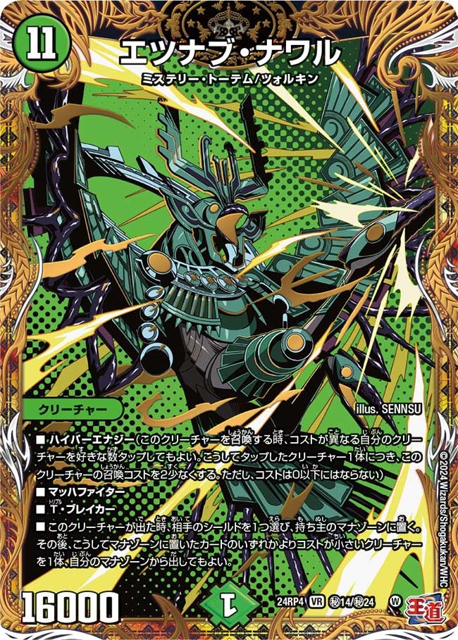 ハイパーエナジー(このクリーチャーを召喚する時、コストが異なる自分のクリーチャーを好きな数タップしてもよい。こうしてタップしたクリーチャー1体につき、このクリーチャーの召喚コストを2少なくする。ただし、コストは0以下にはならない)マッハファイターT・ブレイカーこのクリーチャーが出た時、相手のシールドを1つ選び、持ち主のマナゾーンに置く。その後、こうしてマナゾーンに置いたカードのいずれかよりコストが小さいクリーチャーを1体、自分のマナゾーンから出してもよい。