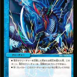 スピードアタッカーヨビニオン(このクリーチャーが召喚によって出た時、自分の山札の上から、これよりコストが小さいクリーチャーが出るまで表向きにしてもよい。そのクリーチャーを出す。残りをシャッフルし、山札の下に置く)このクリーチャーが出た時、自分の手札を1枚捨ててもよい。そうしたら、カードを2枚引く。
