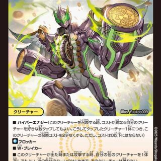 ハイパーエナジー(このクリーチャーを召喚する時、コストが異なる自分のクリーチャーを好きな数タップしてもよい。こうしてタップしたクリーチャー1体につき、このクリーチャーの召喚コストを2少なくする。ただし、コストは0以下にはならない)W・ブレイカーヨビニオン(このクリーチャーが召喚によって出た時、自分の山札の上から、これよりコストが小さいクリーチャーが出るまで表向きにしてもよい。そのクリーチャーを出す。残りをシャッフルし、山札の下に置く)