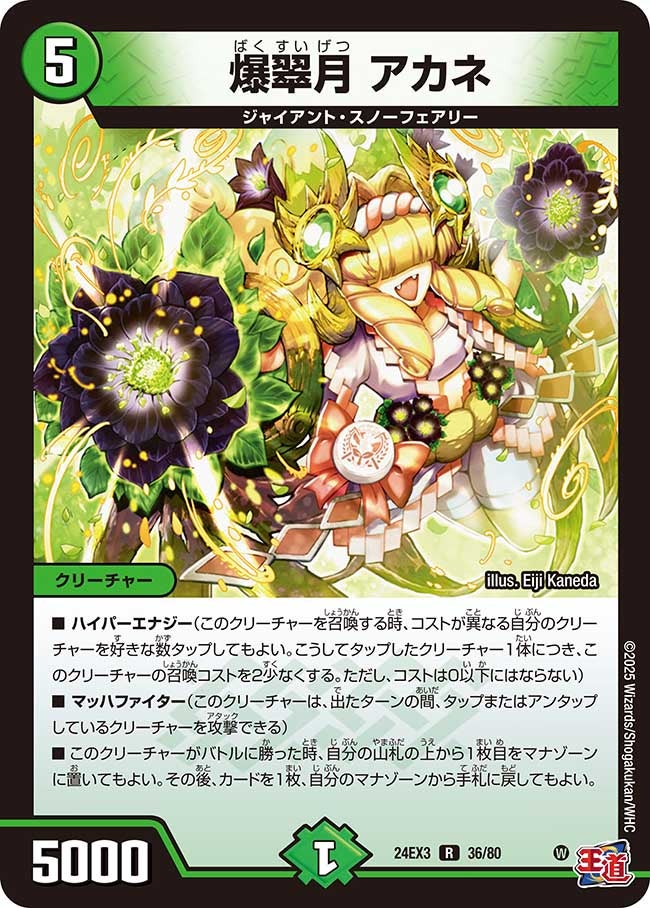ハイパーエナジー(このクリーチャーを召喚する時、コストが異なる自分のクリーチャーを好きな数タップしてもよい。こうしてタップしたクリーチャー1体につき、このクリーチャーの召喚コストを2少なくする。ただし、コストは0以下にはならない)マッハファイター(このクリーチャーは、出たターンの間、タップまたはアンタップしているクリーチャーを攻撃できる)このクリーチャーがバトルに勝った時、自分の山札の上から1枚目をマナゾーンに置いてもよい。その後、カードを1枚、自分のマナゾーンから手札に戻してもよい。