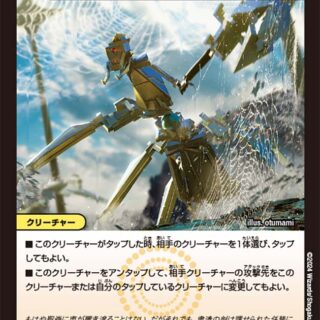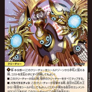 S・トリガー(このクリーチャーをシールドゾーンから手札に加える時、コストを支払わずにすぐ召喚してもよい)このクリーチャーが出た時、または離れた時、相手のクリーチャーを1体選び、持ち主の手札に戻す。