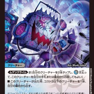 ハイパーエナジー(この呪文を唱える時、コストが異なる自分のクリーチャーを好きな数タップしてもよい。こうしてタップしたクリーチャー1体につき、この呪文のコストを2少なくする。ただし、コストは0以下にはならない)自分の墓地を山札に加えてシャッフルし、その後、自分の山札の上から4枚を見る。その中から、クリーチャーを1体出してもよい。残りを好きな順序で山札の下に置く。