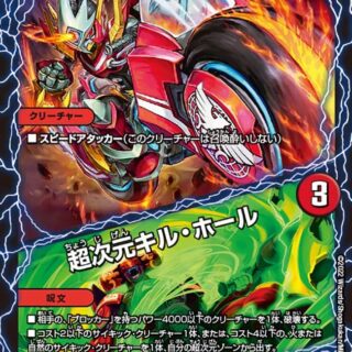 ハイパーエナジー(このクリーチャーを召喚する時、コストが異なる自分のクリーチャーを好きな数タップしてもよい。こうしてタップしたクリーチャー1体につき、このクリーチャーの召喚コストを2少なくする。ただし、コストは0以下にはならない)このクリーチャーが出た時、自分の山札の上から1枚目をマナゾーンに置く。
