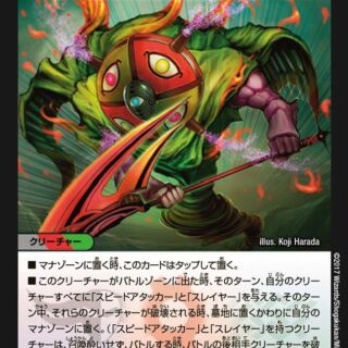 このクリーチャーが出た時、自分のクリーチャーを1体破壊してもよい。そうしたら、相手は自身のクリーチャーを1体選び、破壊する。その後、相手は自身の手札を1枚選び、捨てる。