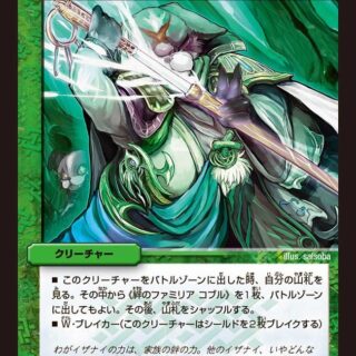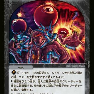 ジャストダイバー(このクリーチャーが出た時、次の自分のターンのはじめまで、このクリーチャーは相手に選ばれず、攻撃されない)相手のターン中に、相手のクリーチャーが召喚以外の方法で出る時、相手はかわりにそのクリーチャーを墓地に置く。