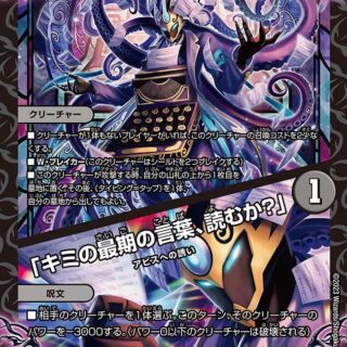 S・トリガー(このクリーチャーをシールドゾーンから手札に加える時、コストを支払わずにすぐ召喚してもよい)ヨビニオン(このクリーチャーが召喚によって出た時、自分の山札の上から、これよりコストが小さいクリーチャーが出るまで表向きにしてもよい。そのクリーチャーを出す。残りをシャッフルし、山札の下に置く)