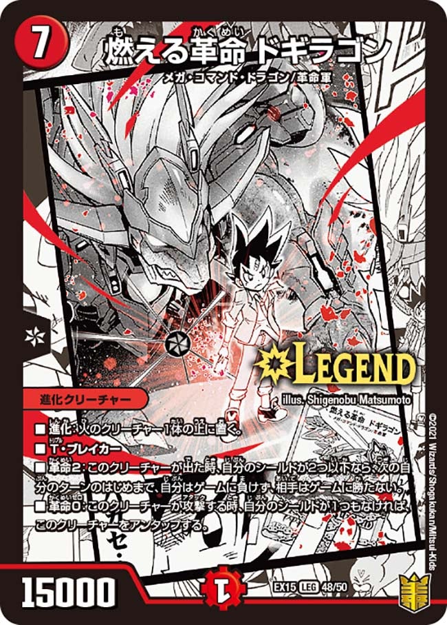 進化:火のクリーチャー1体の上に置く。T・ブレイカー革命2:このクリーチャーが出た時、自分のシールドが2つ以下なら、次の自分のターンのはじめまで、自分はゲームに負けない。革命0:このクリーチャーが攻撃する時、自分のシールドが1つもなければ、このクリーチャーをアンタップする。