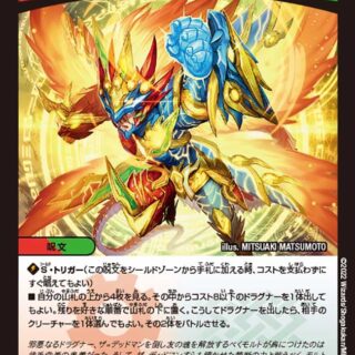 {STP} S・トリガー・プラス(このクリーチャーを自分のシールドゾーンから手札に加える時、コストを支払わずにすぐ召喚してもよい。それが相手のターンで、そのターン中に自分のシールドが2つ以上ブレイクされていれば、このクリーチャーに{x+}能力を与える){x+}このクリーチャーが出た時、相手のクリーチャーをすべてタップする。ブロッカー(このクリーチャーをタップして、相手クリーチャーの攻撃先をこのクリーチャーに変更してもよい)このクリーチャーが出た時、自分の山札の上から3枚を見る。その中から、ドラゴンまたはファイアー・バードを1枚、相手に見せてから手札に加えてもよい。残りを好きな順序で山札の下に置く。