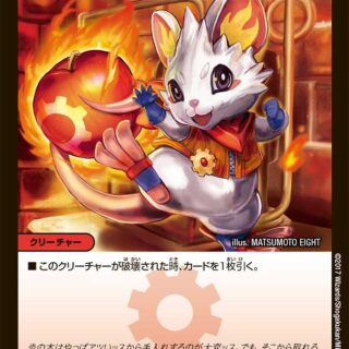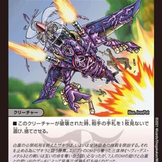 S・トリガー(このクリーチャーをシールドゾーンから手札に加える時、コストを支払わずにすぐ召喚してもよい)このクリーチャーが出た時、相手のコスト3以下のエレメントを1つ選び、破壊する。