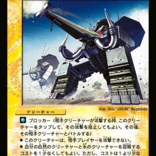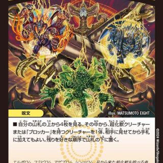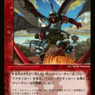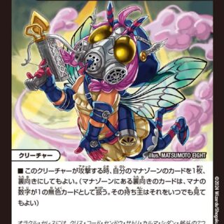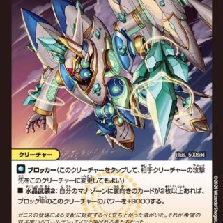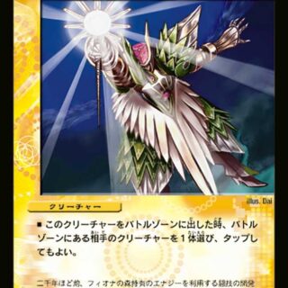 S・トリガー(このクリーチャーをシールドゾーンから手札に加える時、コストを支払わずにすぐ召喚してもよい)このクリーチャーが出た時、コスト3以下のエレメントを1つ選び、持ち主のマナゾーンにタップして置いてもよい。