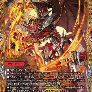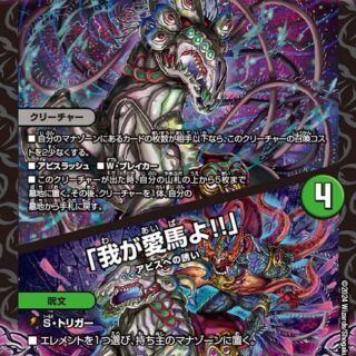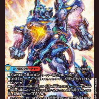 相手のマナゾーンにある文明1つにつき、このクリーチャーの召喚コストを2少なくする。このクリーチャーは、出たターン、相手プレイヤーに攻撃できる。T・ブレイカーこのクリーチャーが攻撃する時、バトルゾーンまたはマナゾーンに自分のジョーカーズが合計5枚以上あれば、バトルゾーンにある相手のカードを各文明1枚ずつ選ぶ。相手はそれらのカードを好きな順序で山札の下に置く。